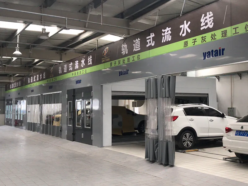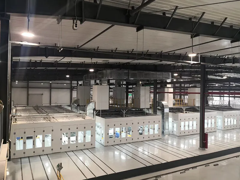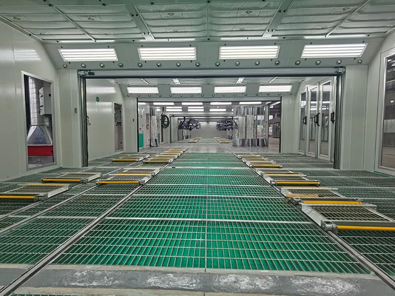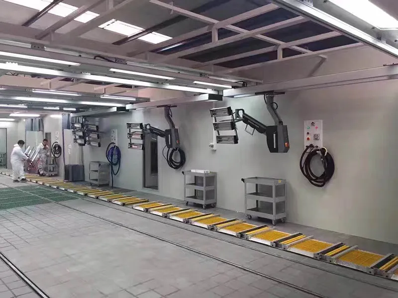 - Esta línea de pintura en polvo para vehículos se compone de una estación de preparación, una cabina de pintura, una guía riel de suelo y un carro portátil.