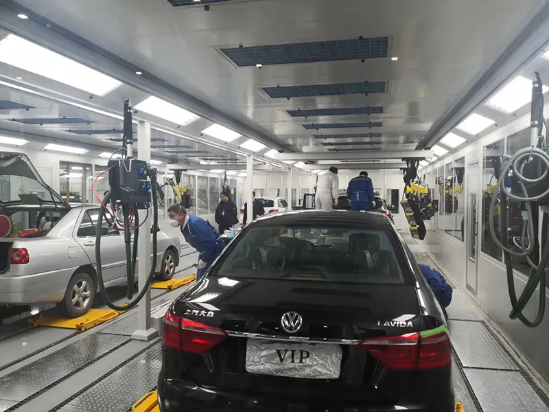 - El vehículo se desplaza entre la zona de preparación hasta la cabina de pintura a través del carril.